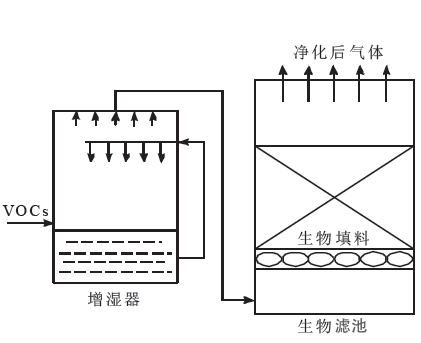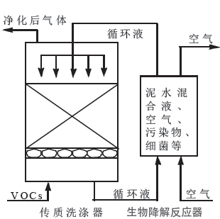 生物洗涤器(下图)反应条件温和、操作稳定;但其运行成本高,处理的VOCs 需要易溶于水。