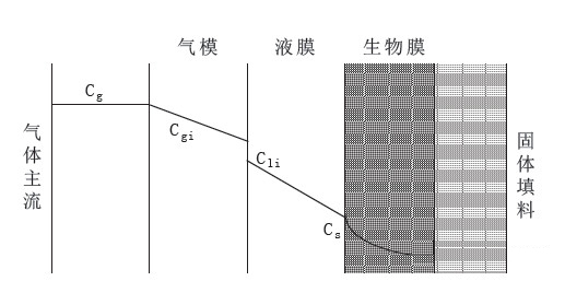 ②在浓度差推动下挥发性有机物从液膜内扩散到生物膜中;